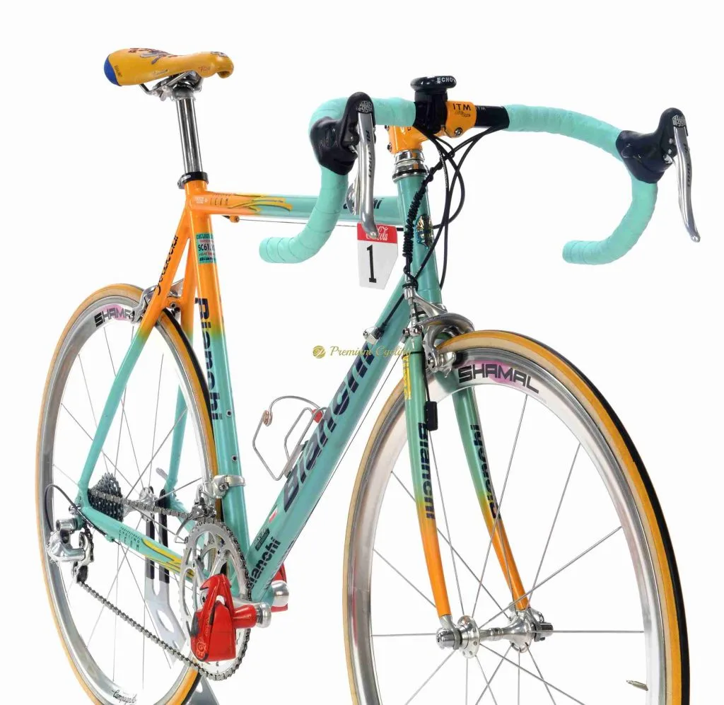 Proudly presenting one of the most iconic bikes in cycling history, the Bianchi Mega Pro Mercatone Uno, very similar to Marco Pantani’s bike on his way to winning Giro d’Italia and Tour de France back in 1998. The frame is shinning in beautiful mix of Bianchi and Mercatone Uno paintjob, build with Campagnolo Record 9s (1998) groupset, Campagnolo Shamal wheels, Record Titanium seatpost, Pantani’s personalized Selle Italia Flite titanium saddle, Time Equipe Mag pedals, titanium bottle cage, so all exact components as used by Marco Pantani at the 1998 Tour de France.