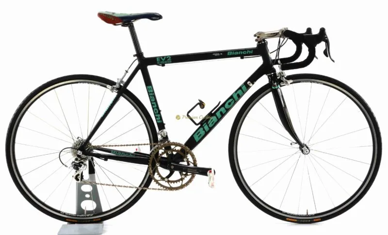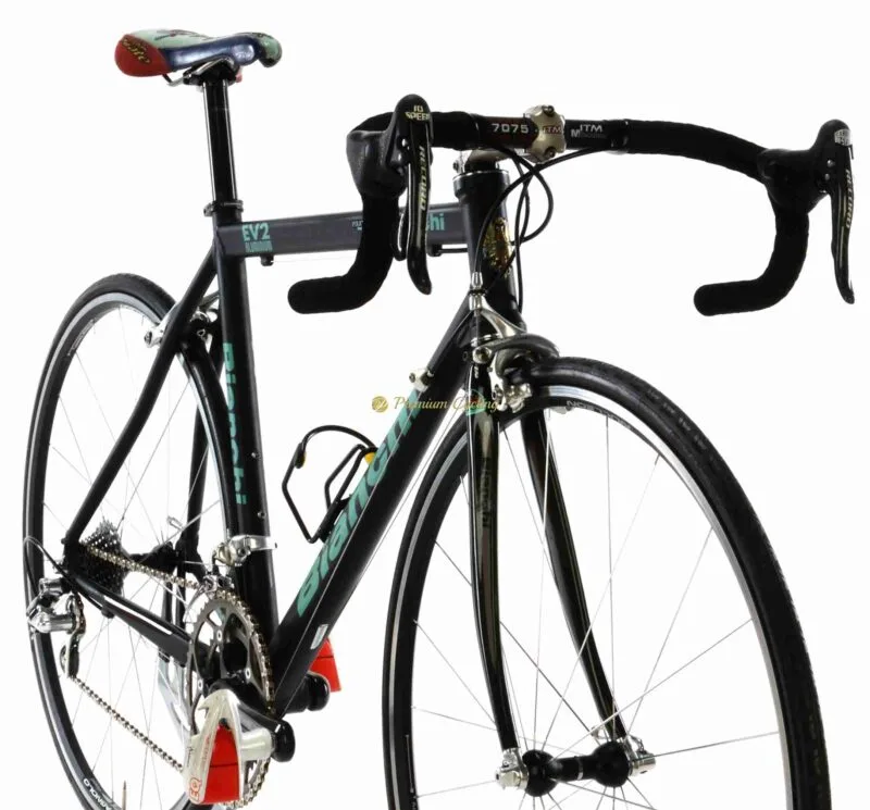 Bianchi’s Reparto Corse (Bianchi’s Race Department) facility hand built frames for their top riders and of course Marco Pantani was one of them riding for Mercatone Uno sponsored by Bianchi. Their top model XL EV2 Reparto Corse is made of lightweight Hyperalloy triple-butted 7k aluminium developed in collaboration with Dedacciai. Aluminum was the material of choice back then, even some his rivals rode full carbon bikes that season. XL EV2 met Pantani’s specifications with slightly sloping geometry, and a relatively short head tube to suit his aggressive in-the-drops climbing style. Though not super-stiff as compared to today’s carbon fiber machines, Pantani’s bike was very light, even by modern standards.