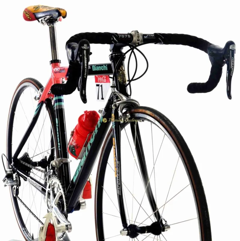 Bianchi’s Reparto Corse (Bianchi’s Race Department) facility hand built frames for their top riders and of course Marco Pantani was one of them riding for Mercatone Uno sponsored by Bianchi. Their top model XL EV2 Reparto Corse is made of lightweight triple-butted alloy shaped tubeset. Aluminum was the material of choice back then, even his biggets rival Lance Armstrong rode full carbon Trek 5500 that season. XL EV2 met Pantani’s specifications with slightly sloping geometry, and a relatively short head tube to suit his aggressive in-the-drops climbing style. Though not super-stiff as compared to today’s carbon fiber machines, Pantani’s bike was very light, even by modern standards.