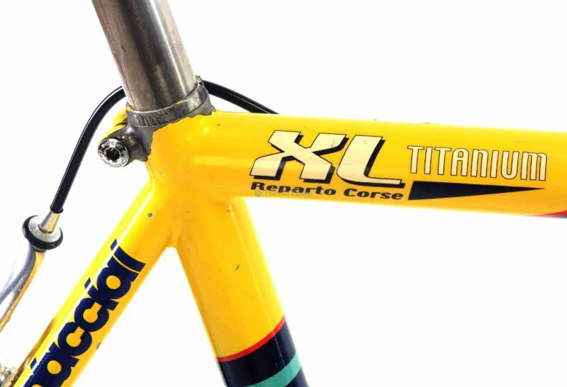 Bianchi’s Reparto Corse (Bianchi’s Race Department) facility hand built frames for their top riders and of course Marco Pantani was one of them riding for Mercatone Uno sponsored by Bianchi. Their top model XL EV2 Reparto Corse is made of lightweight triple-butted alloy shaped tubeset. Aluminum was the material of choice back then, even his biggets rival Lance Armstrong rode full carbon Trek 5500. The XL EV2 was used by Marco Pantani and his teammates: Podenzana, Astarloa, Garzelli, Veloflex, Zaina. But Marco Pantani was using also Bianchi XL Titanium because it felt stiffer. And same happened with Pantani’s teammate, Riccardo Forconi who requested to used XL Titanium bike instead of XL EV2.