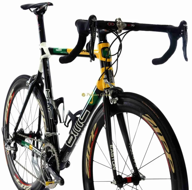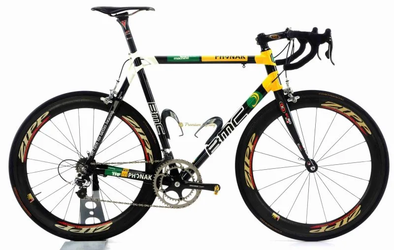 Here we are proudly presenting completely original and authentic pro rider’s bike, the BMC SLT01 of Jose Enrique Gutierrez (Team PHONAK) from the 2006 season. The bike is in excellent and original condition, built with Campagnolo Record Titanium 10s groupset, superb ZIPP racing wheels, Easton parts (stem, handlebar and seatpost), Speedplay pedals, even Continental tubulars are still original. Gutierrez’s last name marked under the bb shell. One of the best bikes in pro peloton back then.