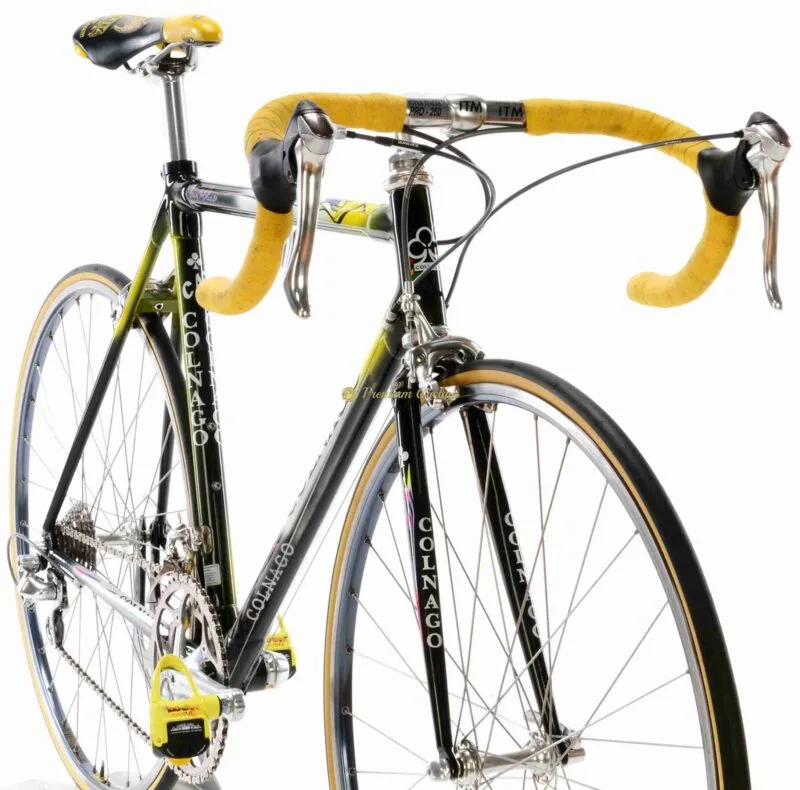 In 1994 Colnago started to produce their very successful model C40 — ‘C’ for carbon and ‘40’ to commemorate Colnago’s 40th year in business. Full carbon frame with Master profile carbon tubes bonded to carbon lugs. Colnago solved the problem of how to make a carbon frame durable enough to win the toughest cobbled Classics yet light enough to soar up Alpine cols. That’s the reason why the C40 is the favourite bike of all time for so many people — including Sir Bradley Wiggins. Colnago could have created something with perhaps a swoopy, futuristic profile befitting its revolutionary design. Instead he kept the tubes ramrod-straight in the traditional style — albeit with the star-shaped cross-section that he had pioneered with the steel Master.