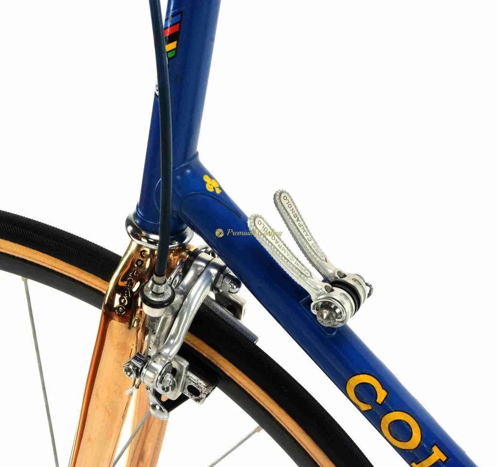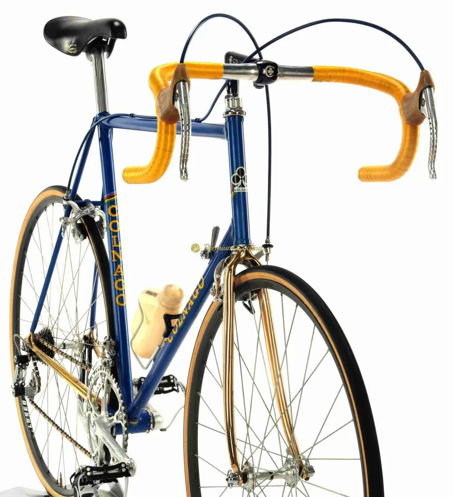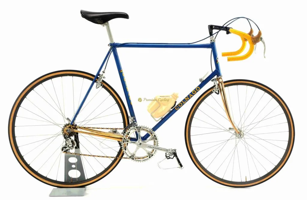 Here we are proudly offering one of the most advanced racing machines of its time – COLNAGO Mexico TT ”Aerodinamica” Oro which dates back to early 1980s. 24k gold plated frame with beautiful blue Colnago paint in original condition with Campagnolo Super Record parts, 3ttt aero handlebar and special Aerodinamica stem… No much words need needed.