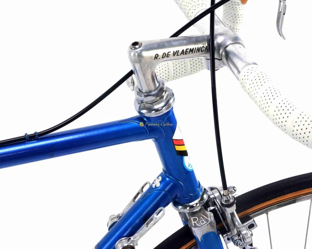 Happy to offer a legendary steel racing machine made by great famous Ernesto – Colnago Roger De Vlaeminck which dates back to 1980. The frame is based on Colnago Super made of superb Columbus SL tubing, with slightly different fork crown. Pantograph RDV appears on seatstay, fork crowns, rear drop-outs, but has Colnago lugs and bb sheell. It’s shining in beautiful RDV paintjob, completelly equiped with top of the line Campagnolo Super Record groupset (RDV pantograph brake levers, chainring, seatpost), 3ttt RDV stem and handlebar, Royal saddle. No much words needed.