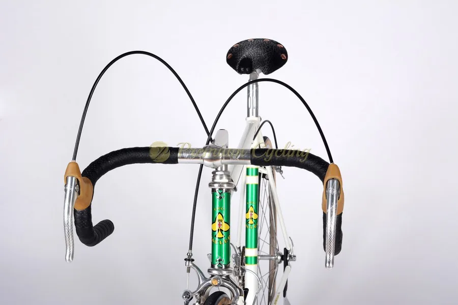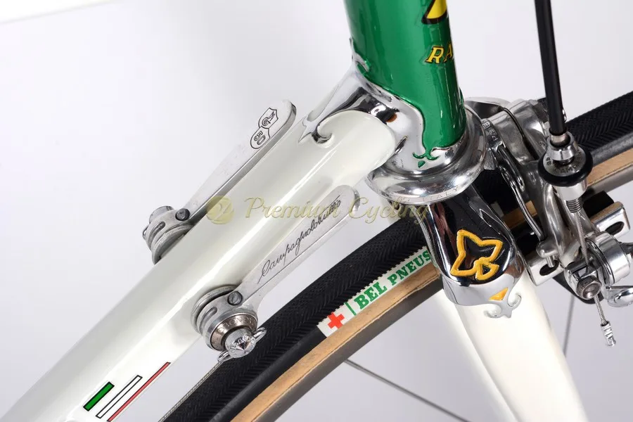Extremelly proud to present one the most special bikes in Premium Cycling store. Anniversary Rauler Special frameset, made of Columbus tubing, welded with special lugs and extraordinary Campagnolo 50th Anniversary complete groupset from 1983 with 24k gold plated parts (No 2564). The combination of white/green/gold frame paint, headtube lugs, iconic groupset, steering set and dropout details is just amazing, so the one can easily spend an hour just looking at these special details.